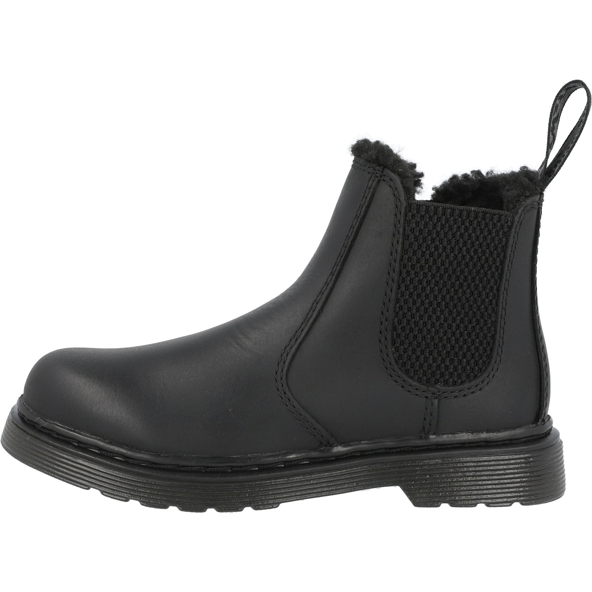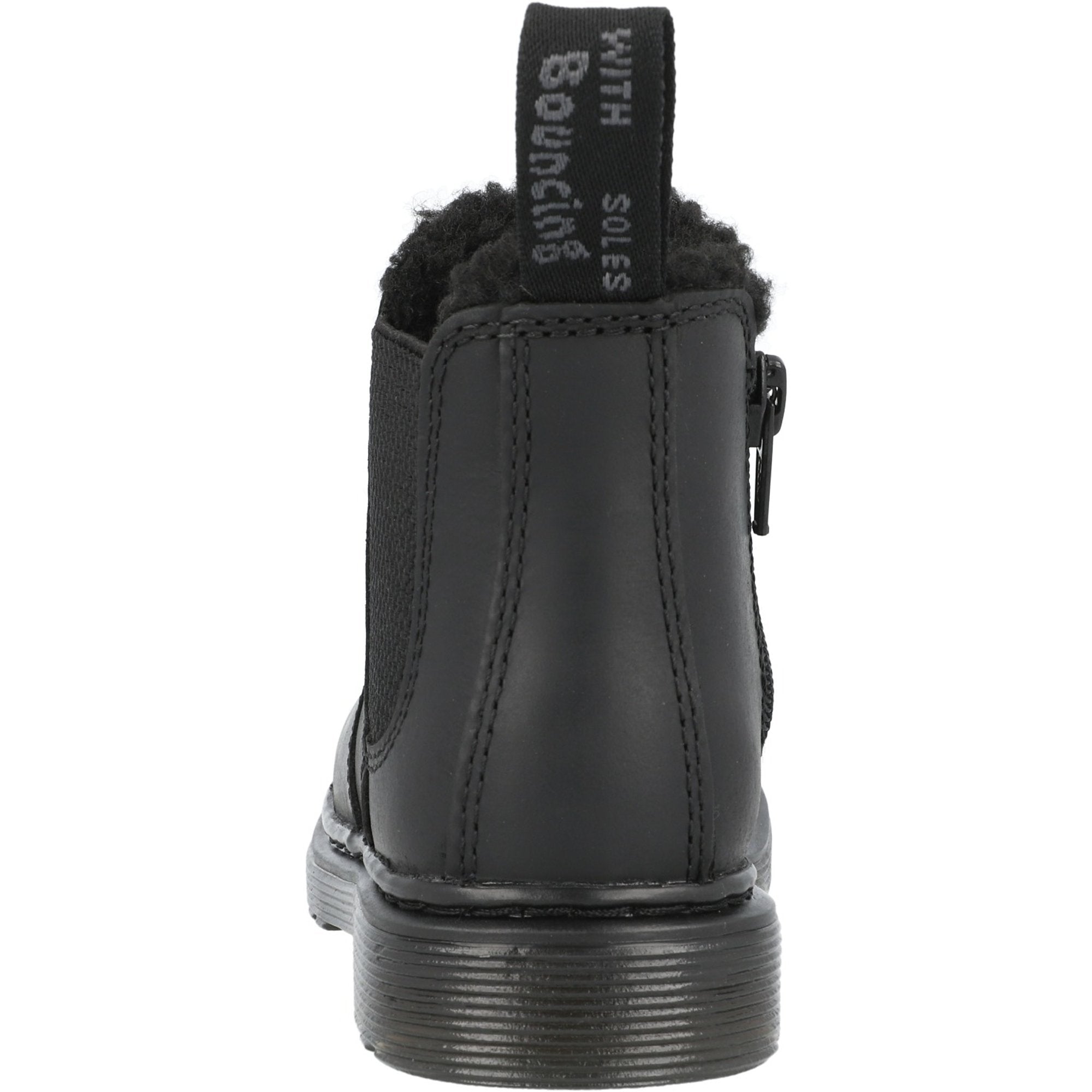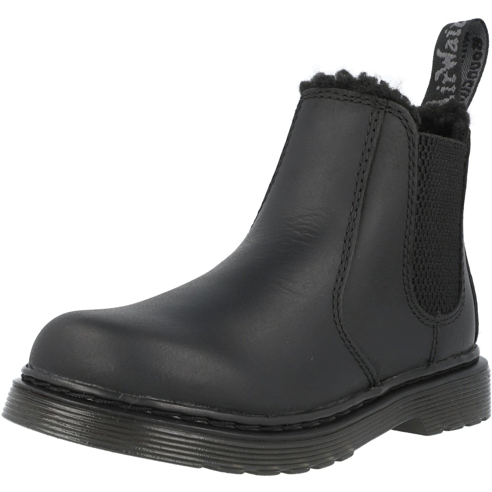 Meet the Dr Martens 2976 Leonore Mono Black Boots, crafted to keep your child’s feet snug and stylish. These hardwearing Chelsea boots feature water-repellent waxy leather and warm Sherpa faux fur lining. A monochrome design with black welt stitching and a unique smoke-colored sole adds to their rebellious spirit, perfect for little adventurers.