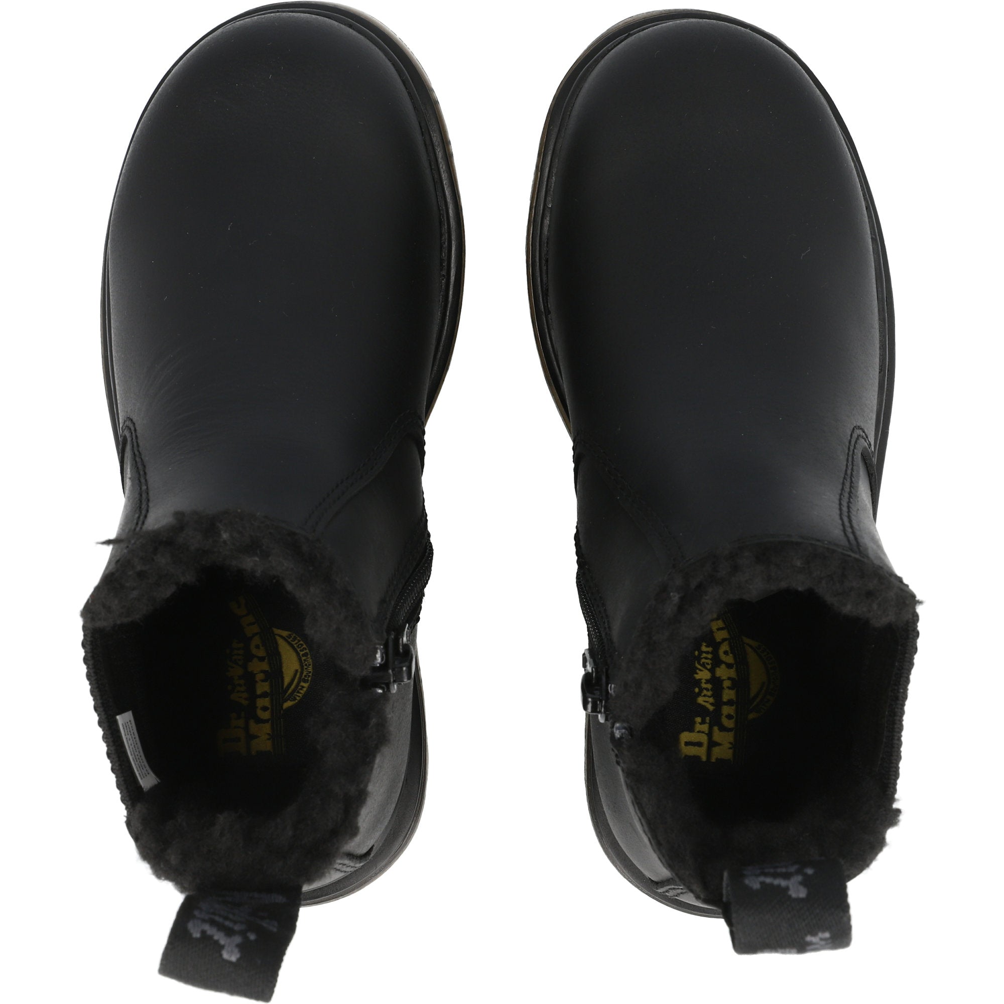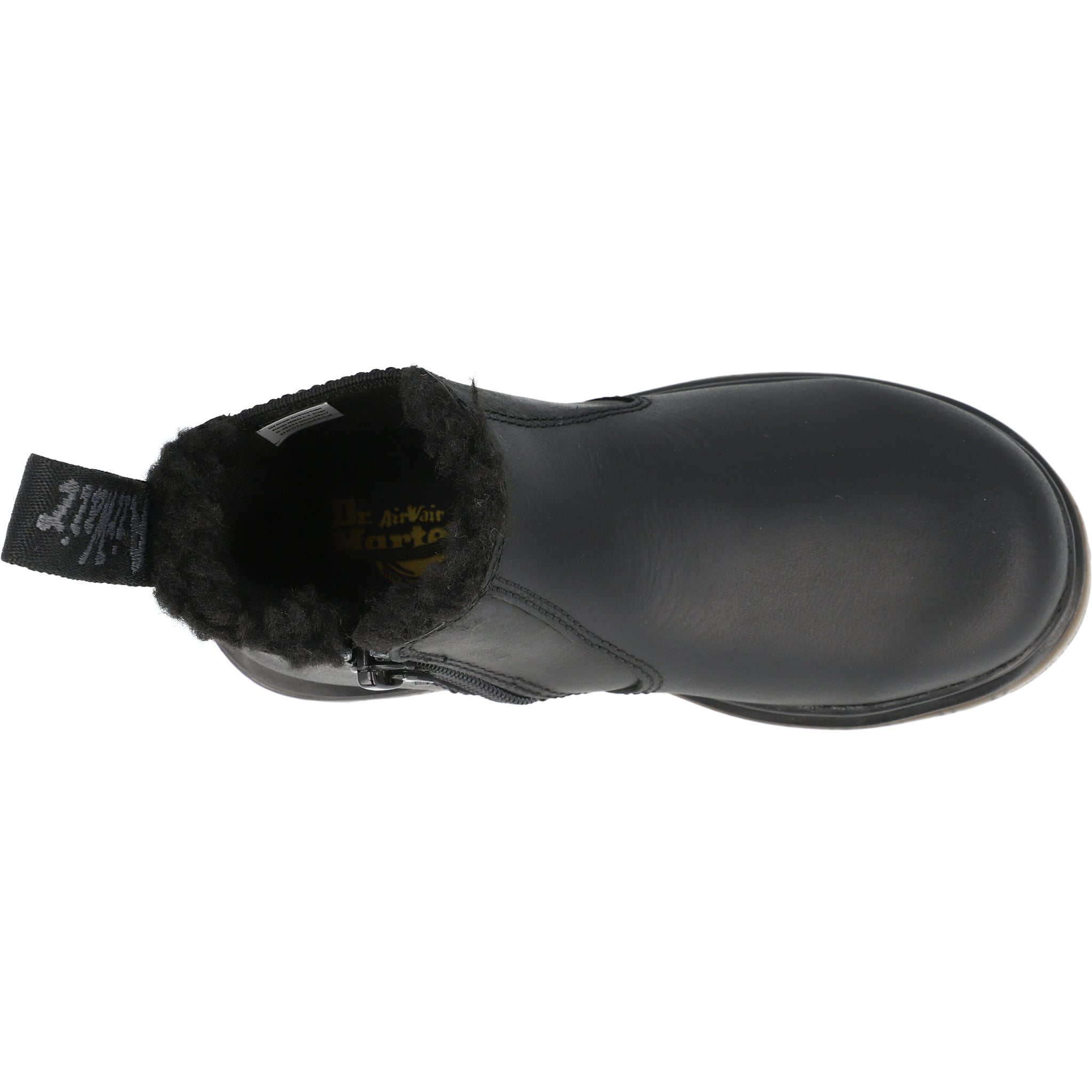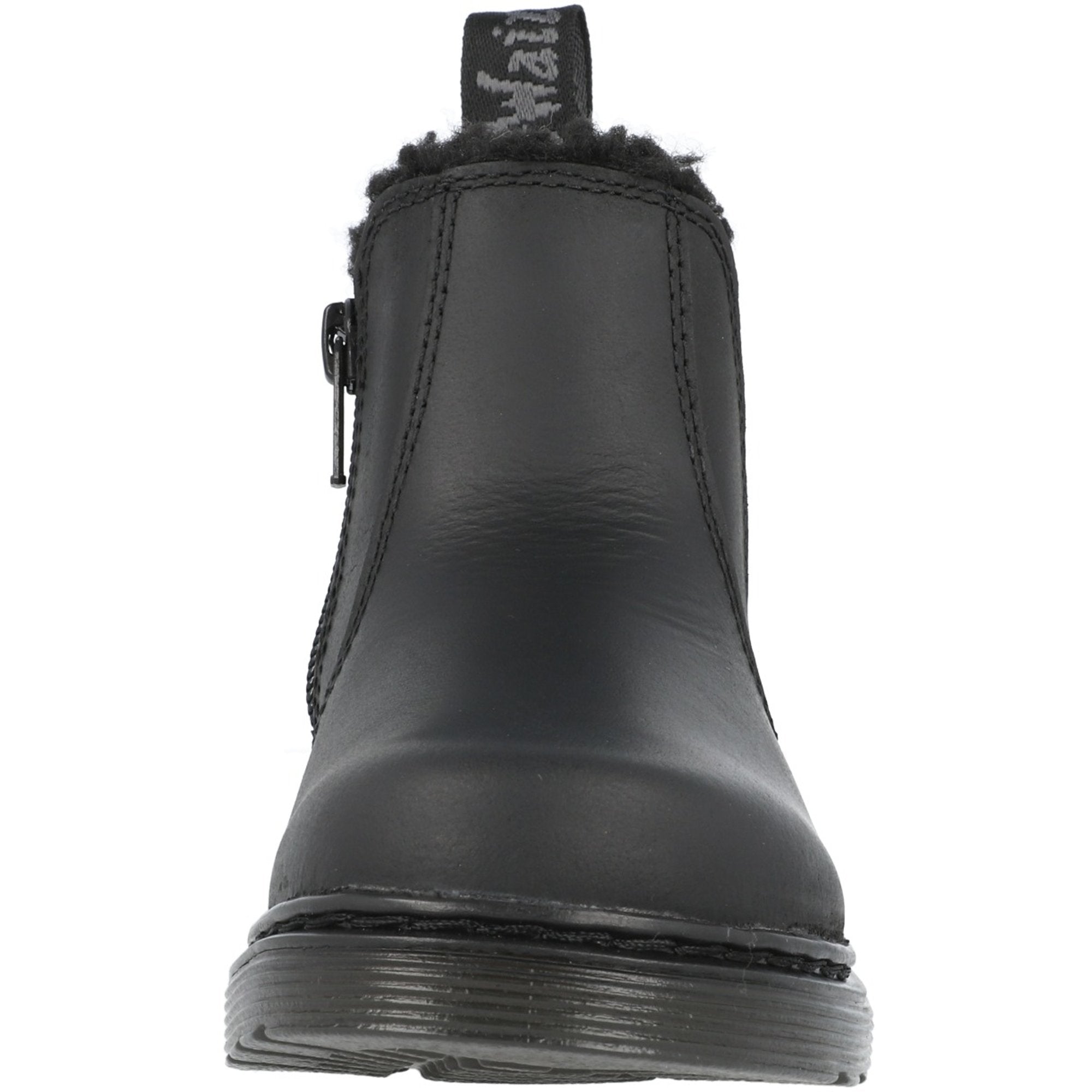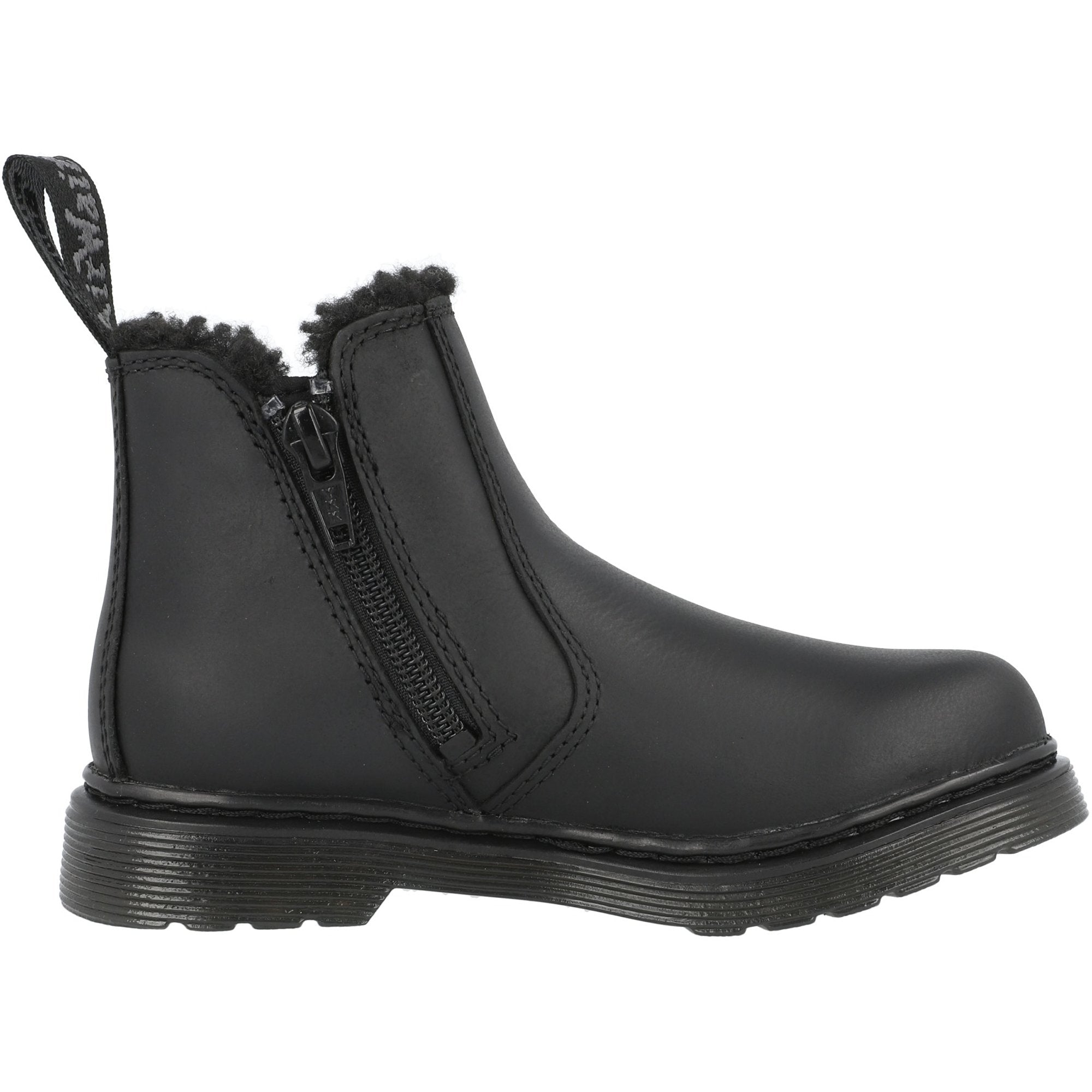 Meet the Dr Martens 2976 Leonore Mono Black Boots, crafted to keep your child’s feet snug and stylish. These hardwearing Chelsea boots feature water-repellent waxy leather and warm Sherpa faux fur lining. A monochrome design with black welt stitching and a unique smoke-colored sole adds to their rebellious spirit, perfect for little adventurers.